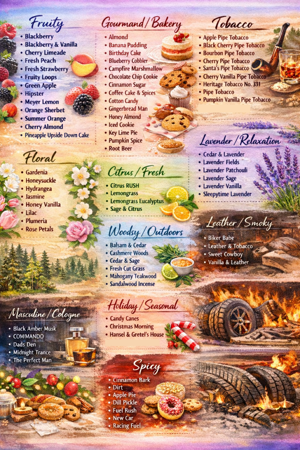 Cedar & Lavender: Warm earthy scent of cedar, with base notes of vanilla and musk mixed with our fresh lavender aroma.